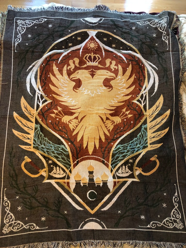 Here are all of the things that you could have gotten in this box, depending upon the size as well as who made them. I really wish I had received the character cards and the mug, I totally would have traded those for some of my other stuff. (Honestly, I may sell the tapestry blanket, chess pieces, book sleeve, and plush so that I can fund that mug and the character cards. Is that feasible?)