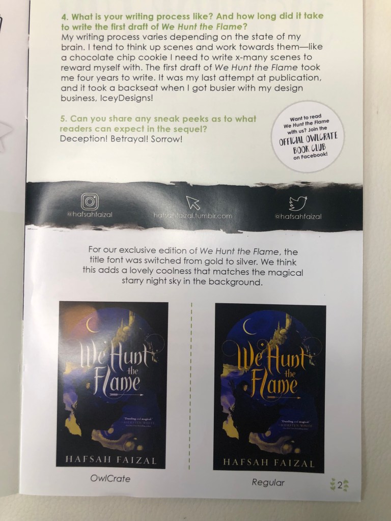 I love epic adventures, but I really wanted this box because “Our book pick is a very highly anticipated fantasy debut full of dark magic, scorching deserts, forests filled with dangerous shadows, and a group of unlikely allies. It features lush storytelling and a world inspired by ancient Arabia.” Sold.