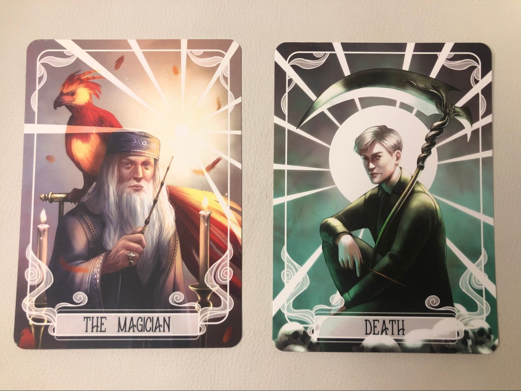 Obviously, the Magician is Dumbledore. I’ve seen a lot of people call Death Draco, but I don’t know. Draco was my first instinct when looking at the picture, but the elements of it just don’t match Draco.