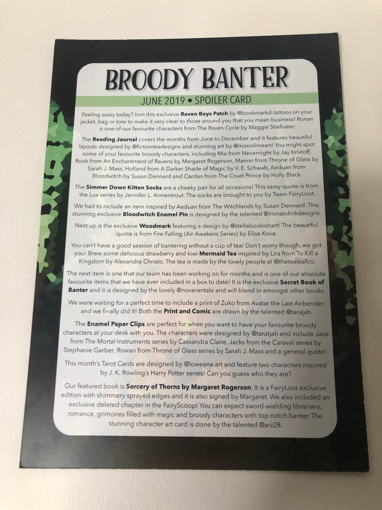 I am obsessed with the book and I hope I love the world that Rogerson has built. I plan to start reading it soon! But I also love the paperclips, the tarot cards (of course), and the fake book. This was such a good box!