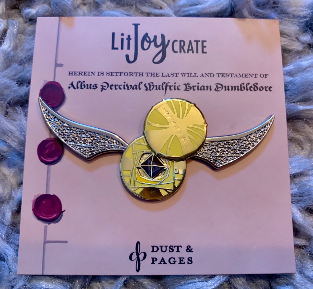 If you look closely you can see that it says “I open at the close” and has the resurrection stone inside it when you “open” the snitch pin. Really cool touch!