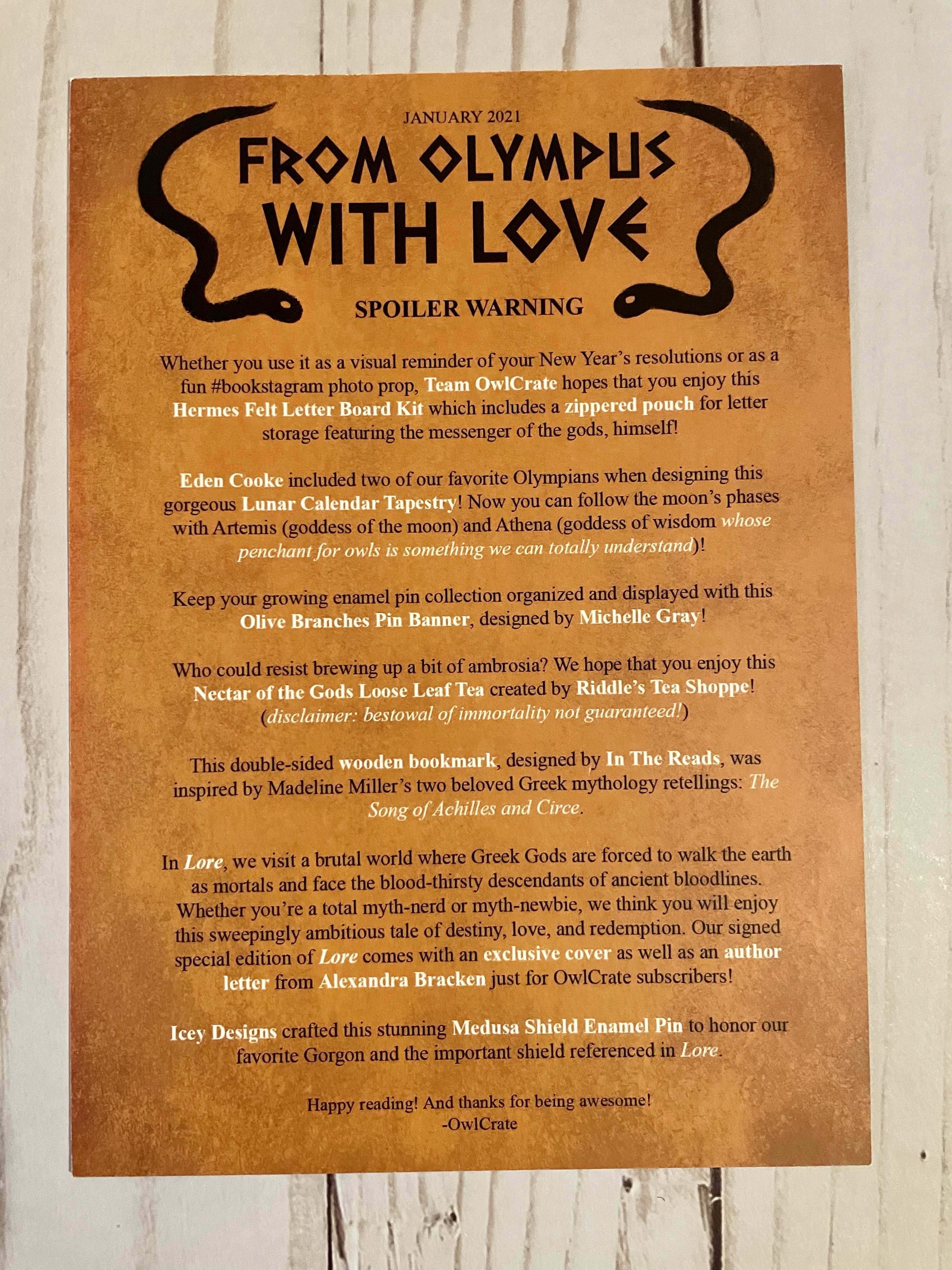 One response to “Owlcrate Unboxing – From Olympus with Love (January 2021)”