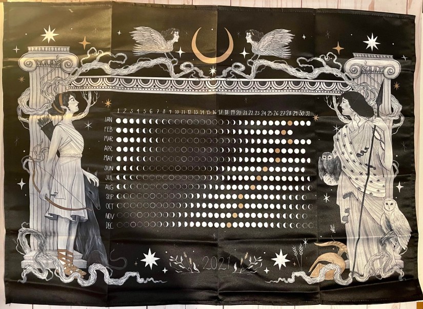 I have a metal moon phases wall hanging over my bed and I put moon/star scrapbook paper behind the glass of the cabinet in my room (it looks better than it sounds), so this fits the celestial theme and now I need to figure out where to hang it (and how)!